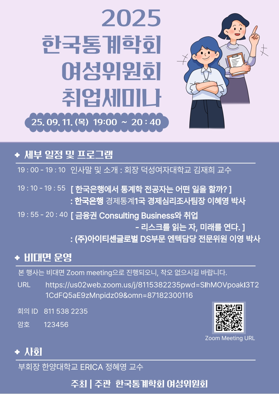 | 2024년 한국통계학회 여성위원회 SWAN 리더쉽 세미나 (0) | 2024.12.16 |